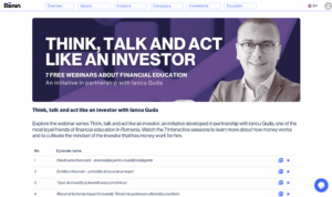 All 7 episodes from “Think, talk, and act like an investor” series hosted in partnership with Iancu Guda can be viewed only inside the platform. They are also accompanied by educational support material in PDF format. We hope that all the information throughout this series will help our investors put their money to work, add value to all their investment initiatives, and facilitate the path to financial freedom.