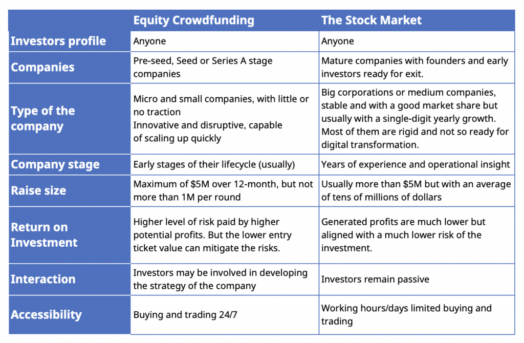 A simple definition for equity crowdfunding can sound like this: this is a method of raising capital from crowd investors to finance a private business. Investors receive an ownership stake of the company in exchange for money. Equity crowdfunding usually takes place on online platforms, where companies create a complete profile in order to run a fundraising campaign, including their arguments and financial statements, among other information about the company. Let’s look at two investment options: equity crowdfunding and stock market, and see what the differences are between them.